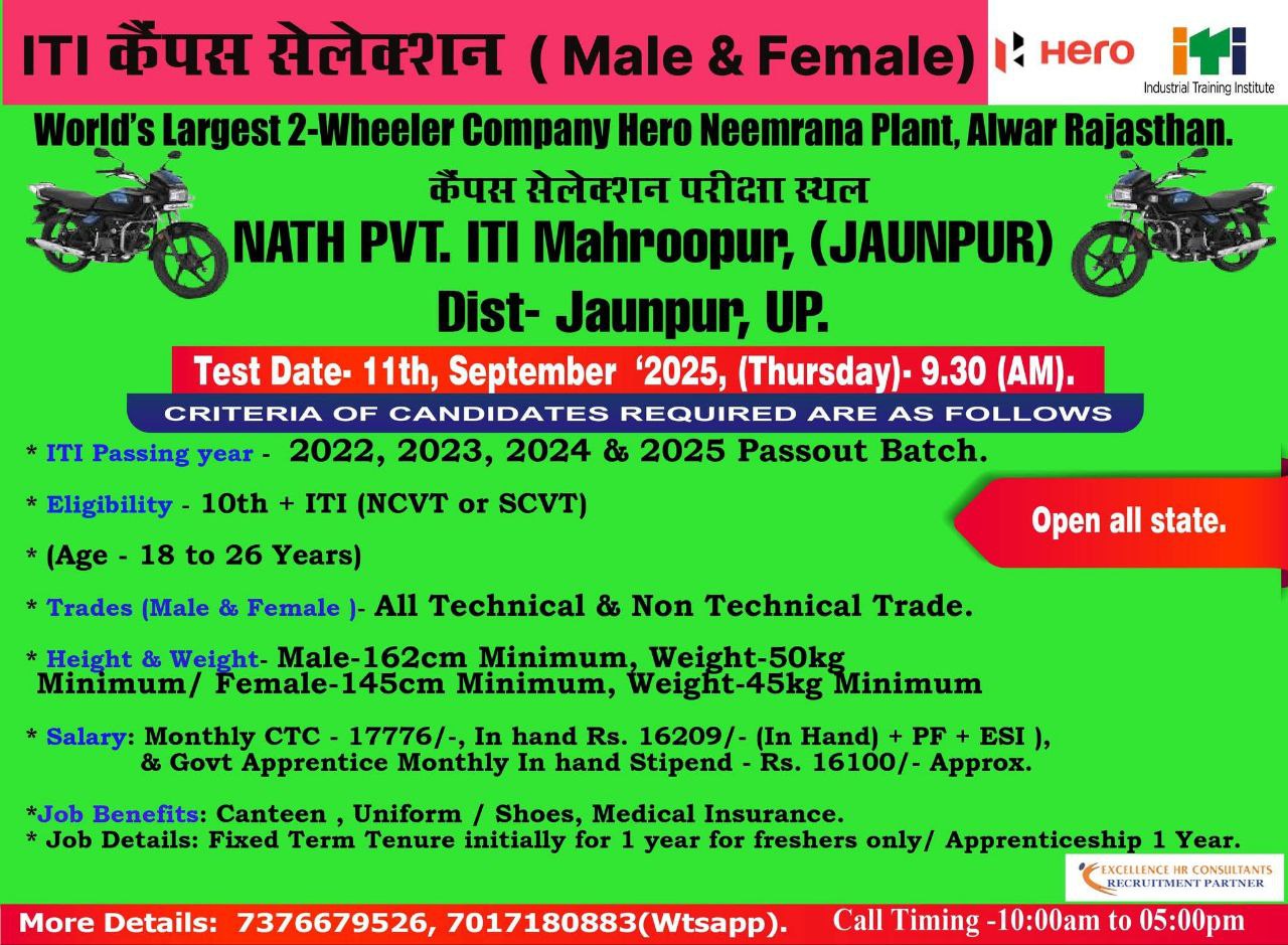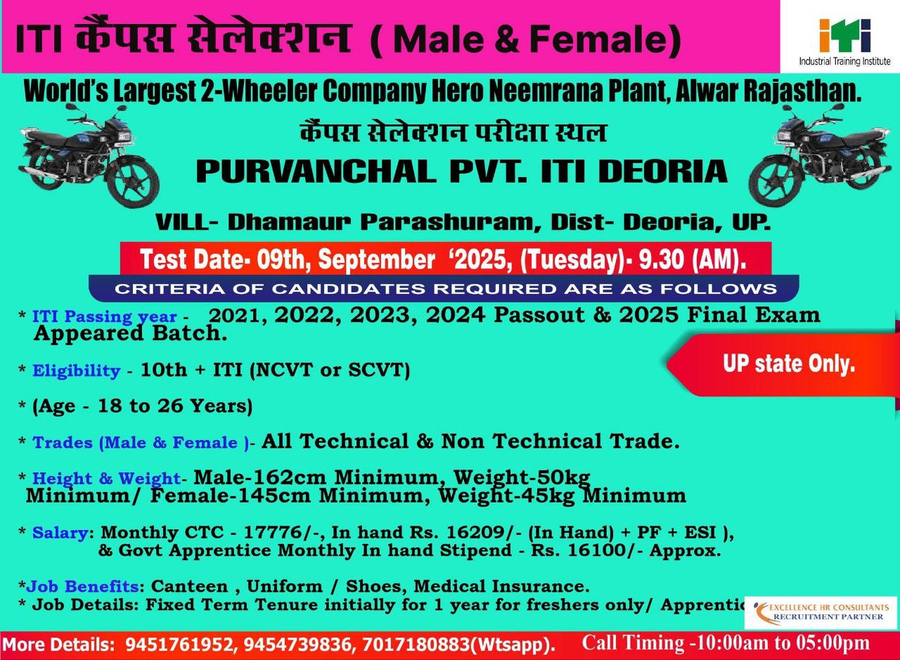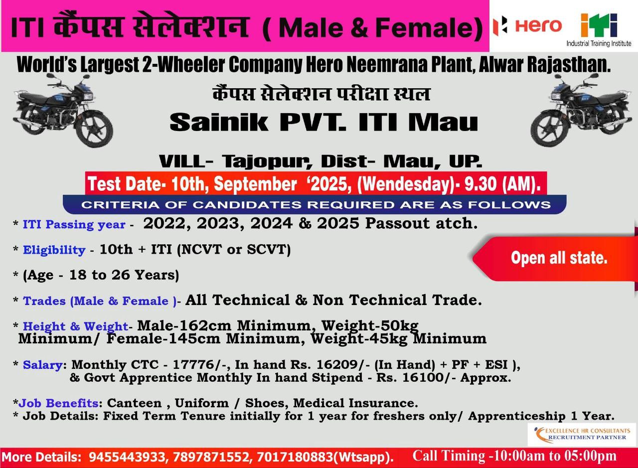 Hero MotoCorp Neemrana Recruitment 2025 | ITI Job | Hero Company Job