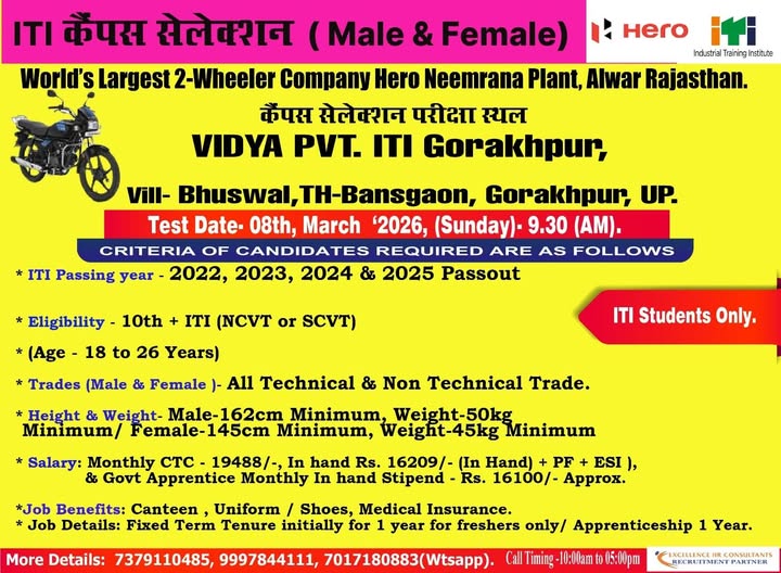 Hero MotoCorp Neemrana Recruitment 2026 | ITI Job | Hero Company Job