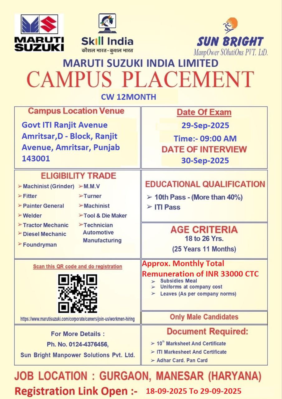 Maruti Suzuki CW Vacancy 2025: सभी आईटीआई उत्तीर्ण छात्रों को सूचित किया जाता है कि मारुति सुजुकी लिमिटेड कंपनी द्वारा 500 से अधिक अनुबंधित कार्यकर्ता (CW) पदों के लिए भर्ती प्रक्रिया आयोजित की जा रही है। इसमे सभी योग्य आईटीआई पास उम्मीदवार भाग ले सकते हैं। इस प्लेसमेंट में शामिल होने के लिए ऑनलाइन पंजीकरण अनिवार्य है। इच्छुक उम्मीदवार समय पर अपना पंजीकरण सुनिश्चित करें और इस अवसर का लाभ उठाएं।